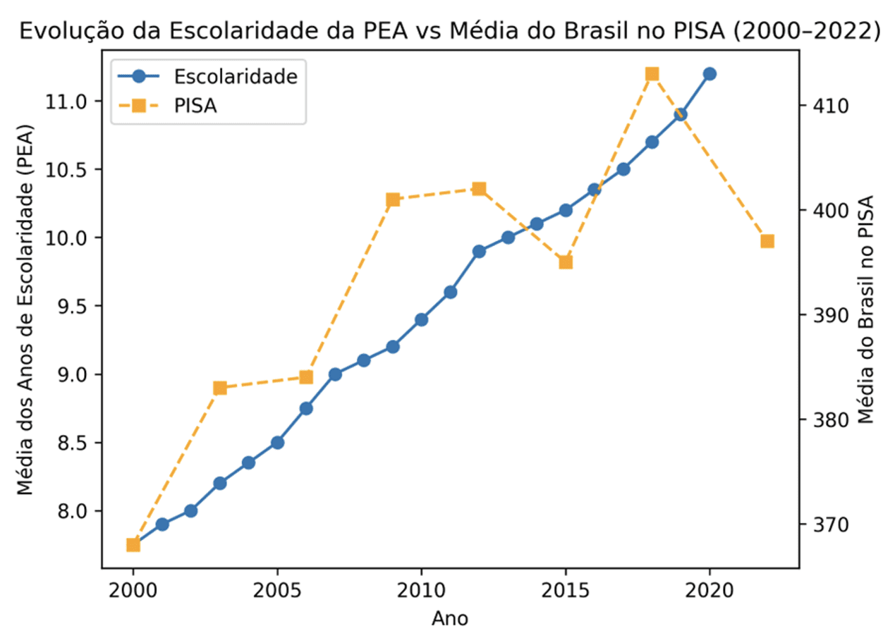 O gráfico abaixo apresenta a evolução da média dos anos de escolaridade da População Economicamente Ativa (PEA) ocupada e a média das três notas do Brasil no PISA, desde 2000 até recentemente. É possível ver, primeiramente, que a média dos anos de escolaridade da População Economicamente Ativa (PEA) ocupada teve uma evolução crescente praticamente linear no período analisado, alcançando um crescimento superior a 40% durante as duas primeiras décadas deste século.