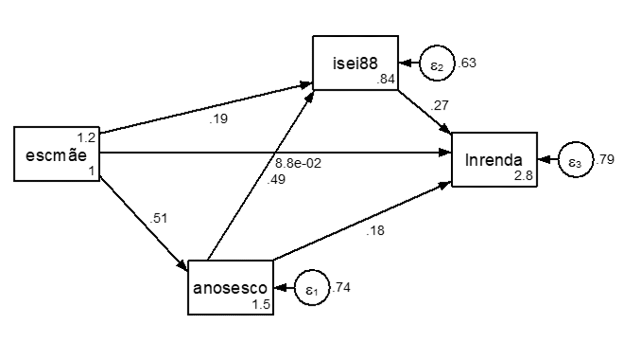 O diagrama abaixo traz a exposição gráfica de um Modelo de Equações Estruturais contendo apenas variáveis observadas (o que o torna uma Análise de Trajetórias), com elevado nível de ajuste estatístico. Trata-se de um modelo tradicional simplificado muito utilizado nos estudos sociológicos sobre determinação dos rendimentos do trabalho (sobre modelos de equações estruturais, ver meu livro publicado pela ENAP, em 2018).
