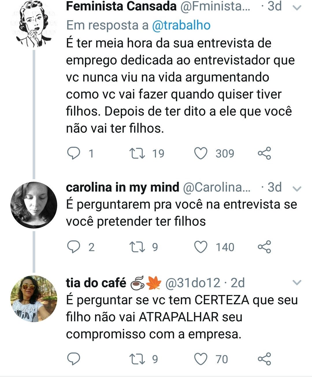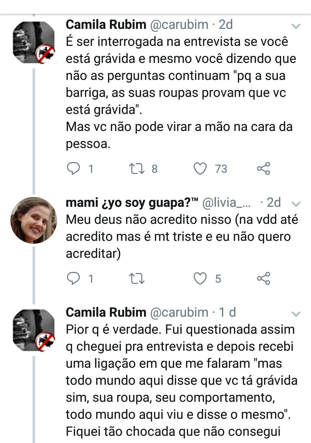 Imagem: Reprodução/TwitterComo é o caso da Camila, que foi questionada se estava grávida durante uma entrevista de emprego.