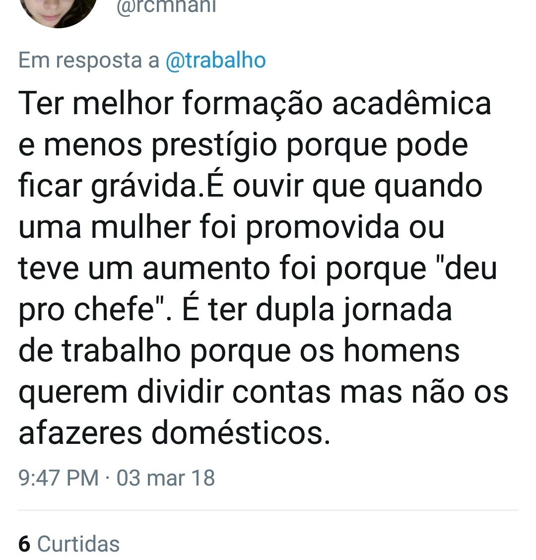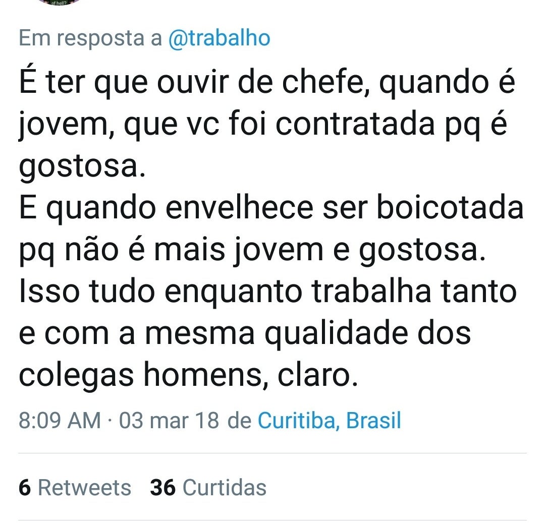 Imagem: Reprodução/TwitterAliás, subir na carreira é sempre uma barreira para as mulheres, já que, quando são promovidas, sempre tem alguém para falar que isso aconteceu porque “deram pro chefe”.