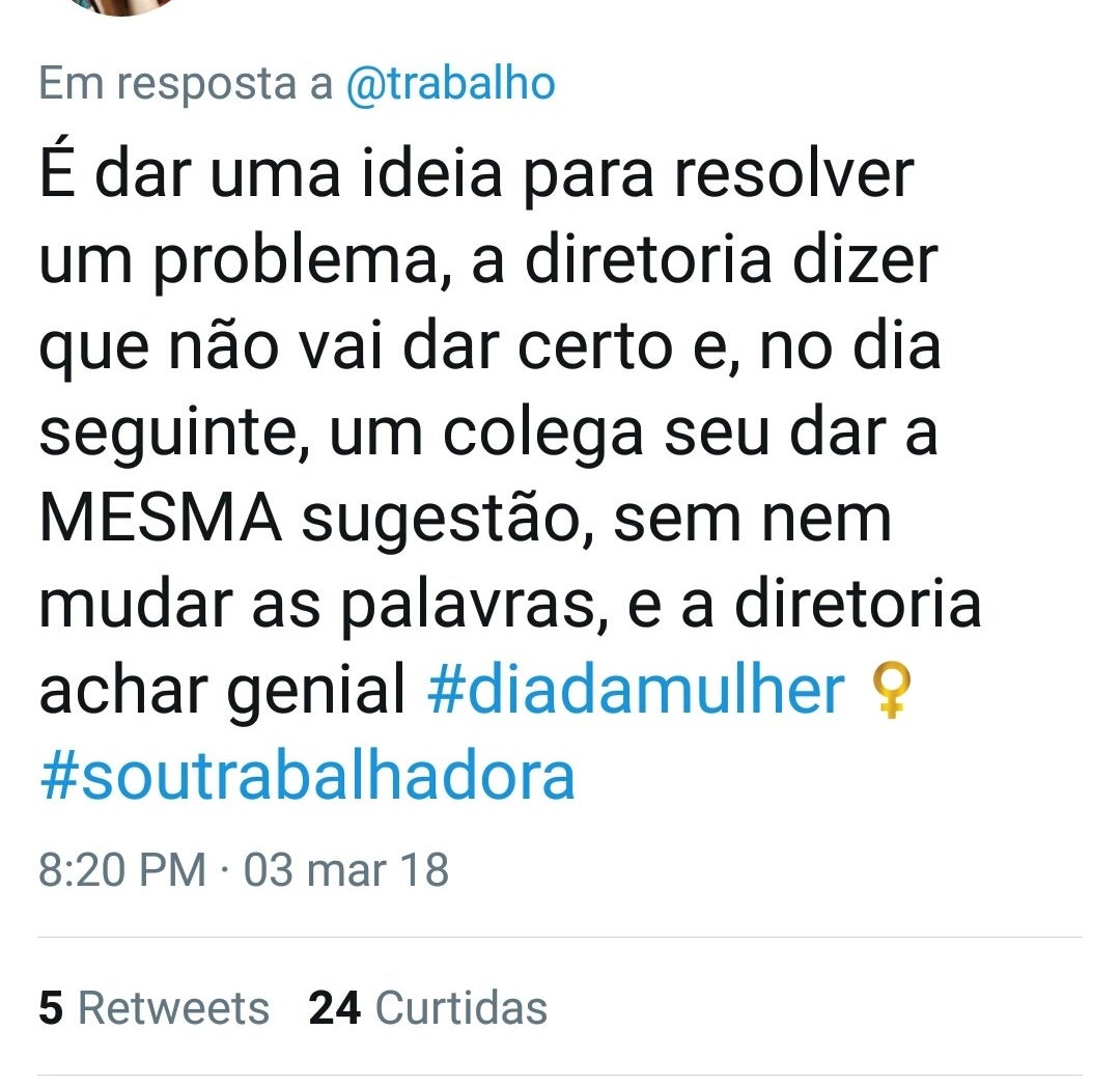 Imagem: Reprodução/TwitterOutra realidade comum para as mulheres no mercado de trabalho é ter as suas ideias roubadas por homens.