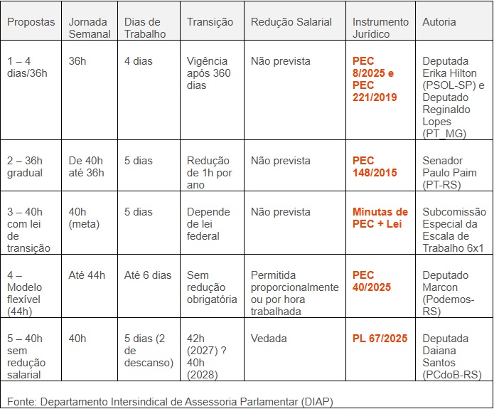 O resumo e os principais pontos de cada uma das propostas refletem modelos distintos sobre a jornada de trabalho, sendo positivas as que permitem a redução estrutural para 36 horas e possível semana de quatro dias sugeridos nas propostas 1, 2 e 5; e fixação de 40 horas com proteção salarial e transição gradual; e negativas a manutenção do teto de 44 horas com ampliação da flexibilidade contratual previstas nas propostas 3 e 4.
