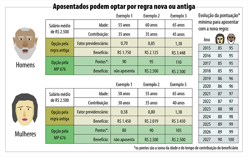 Segundo a nova regra, a mulher que tiver, no mínimo, 30 anos de contribuição para a Previdência Social, poderá se aposentar sem o fator previdenciário se a soma da contribuição e da idade atingir 85. No caso do homem, os 35 anos de contribuição somados à idade devem atingir 95, no mínimo.